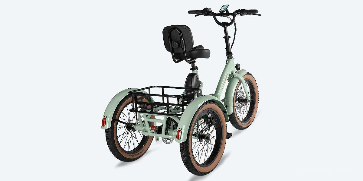 The aluminum step-through frame allows easy mounting, with a 17.5-inch standover height. Measuring 69 inches long and 30 inches wide at the rear, it fits through most residential spaces while still providing stability. A foldable design helps with transport in larger vehicles. Standard models come in Matcha Green or Matte Graphite, while the Grateful Dead edition adds retro styling. The trike weighs 84.6 lbs (38 kg), typical for its class.