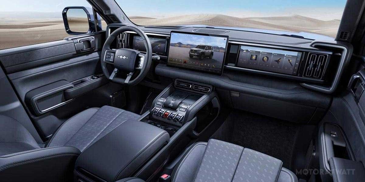 Styling follows a “Future Starship” motif: upright silhouette, chamfered edges, and squared arches over 20-inch alloys (275/55 R20). Matrix-grade LEDs on upper trims carve precise beams; the DRL signature wraps cleanly into the rear clusters. The hydraulic system’s ride-height range improves aero on highways and clearance off-road. Dimensions advertise presence: 5,195 mm (204.6 in) long, 1,994 mm (78.5 in) wide, 1,905 mm (75.0 in) tall with rack; wheelbase spans 2,920 mm (115.0 in).